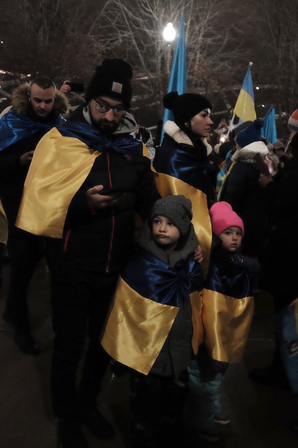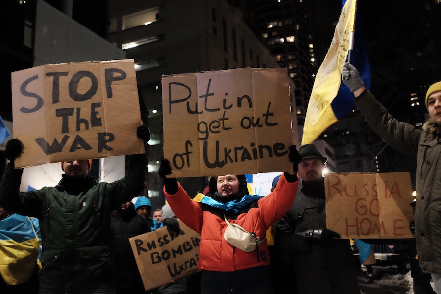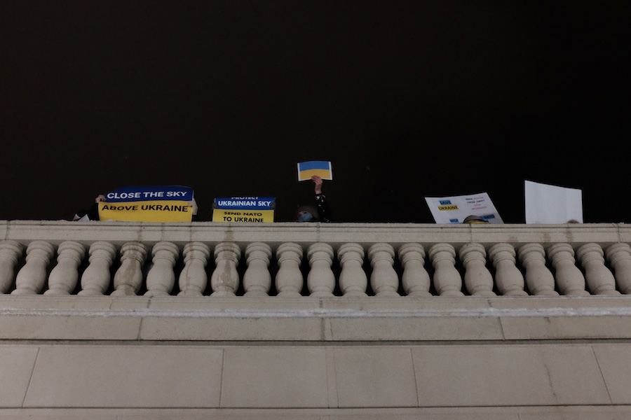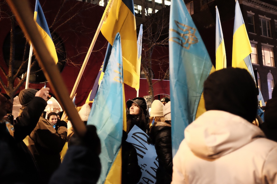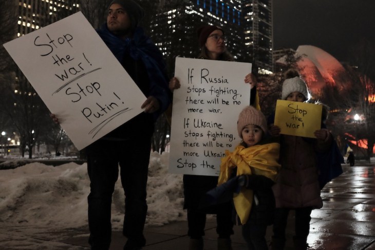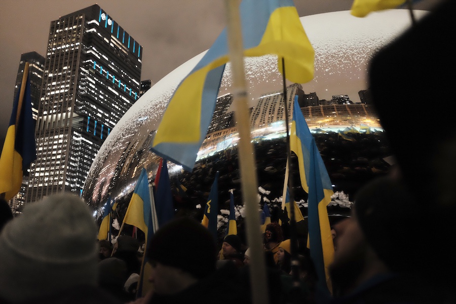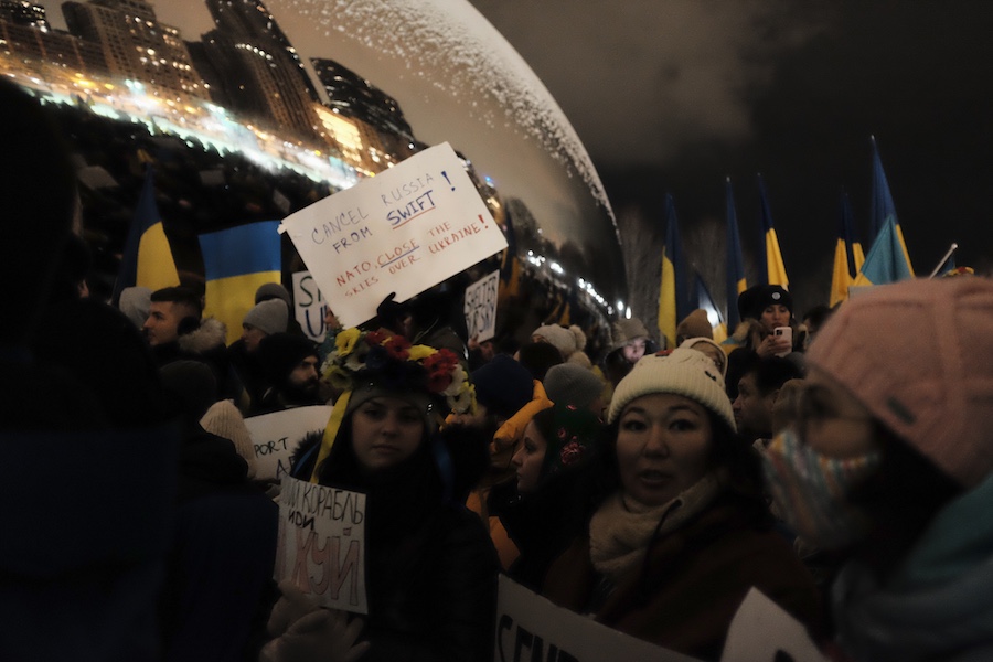 When I arrived at the Bean, a handful of demonstrated had already gathered. Some waved the gold and blue Ukrainian flag, others with signs with signs ranging from a plea for peace to action and intervention by NATO.