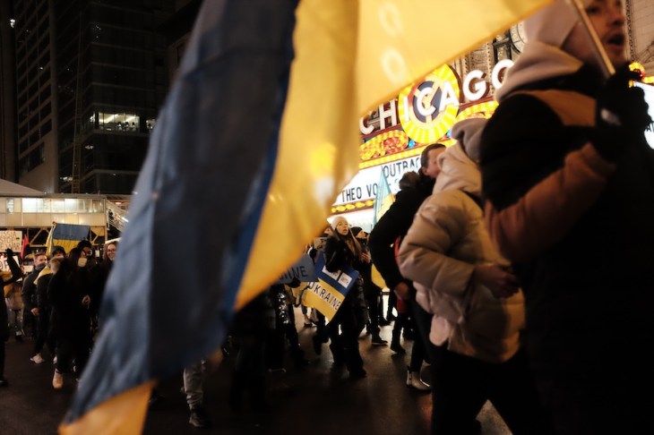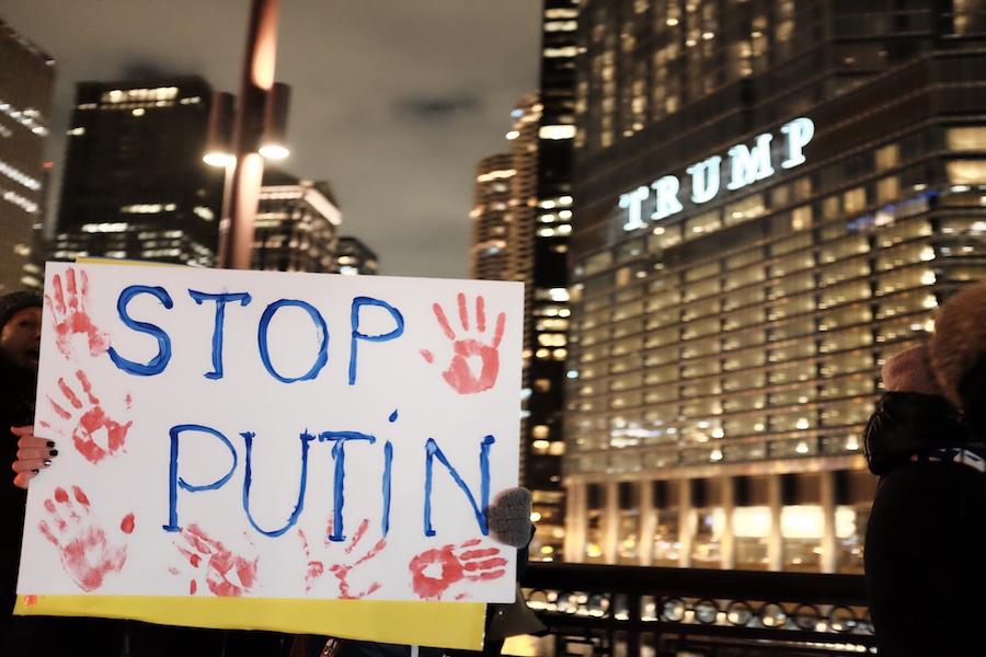 It was not long before the crowd swelled, as more Ukrainians and supporters arrived. More gold and blue fluttered in the biting Chicago wind as flurries fell. As more signs calling for action and help emerged, it was quite clear who the true enemy was deemed to be–not Russia herself, but rather, PUTIN.