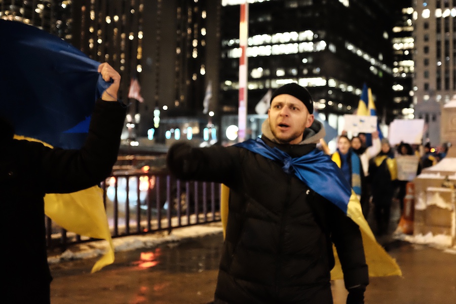 After some time at the consulate, the crowd regrouped and proceeded on State Street heading south. This time marching on the street itself as CPD had cleared them a path, they continued their chants pleading for NATO intervention and condemning Putin.