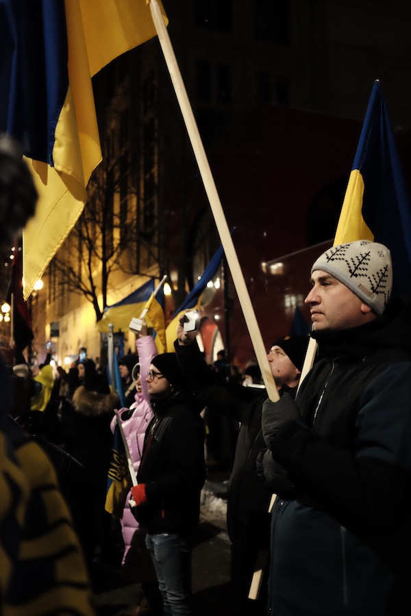 Turning west at Huron Street, it eventually became clear to me the marchers’ destination–the Ukrainian consulate. Once again, the Ukrainian national anthem roared on the street in between the canyon of buildings, followed by a resounding round of chants of, “SLAVA UKRAINI! HEROYAM SLAVA!”