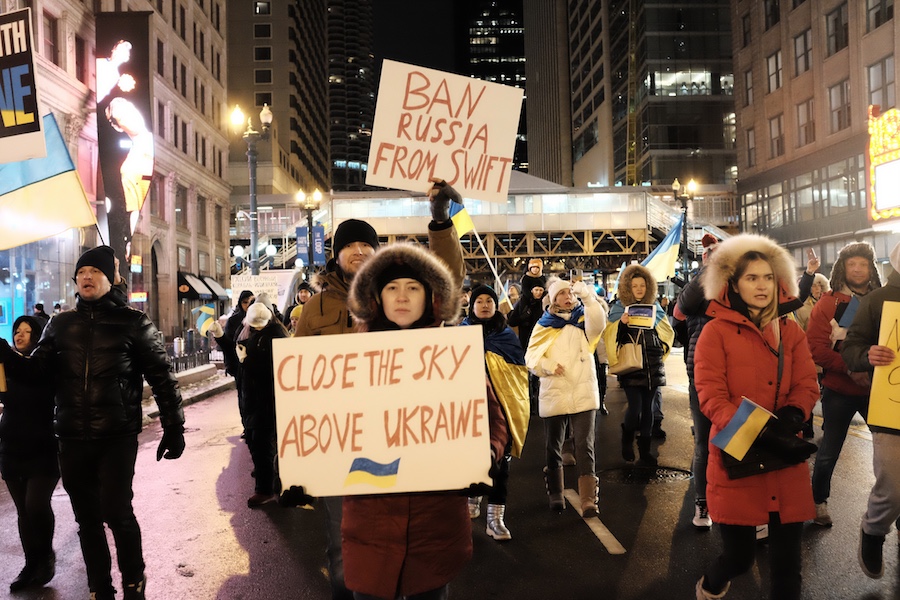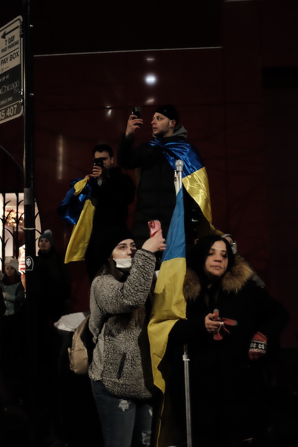 The crowd then formed into columns and marched out of Millennium Park towards Michigan Avenue. As they forged ahead north on the sidewalk, chanting for help and condemning Putin, cars driving by honked in solidarity and support.